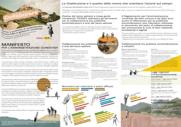 Il manifesto rilancia quindi le buone ragioni e gli effetti positivi che le collaborazioni producono, riepilogando i riferimenti normativi e richiamando la pluralità di strumenti che si possono impiegare per promuovere processi partecipati e inclusivi, capaci di valorizzare le energie che le comunità locali esprimono.