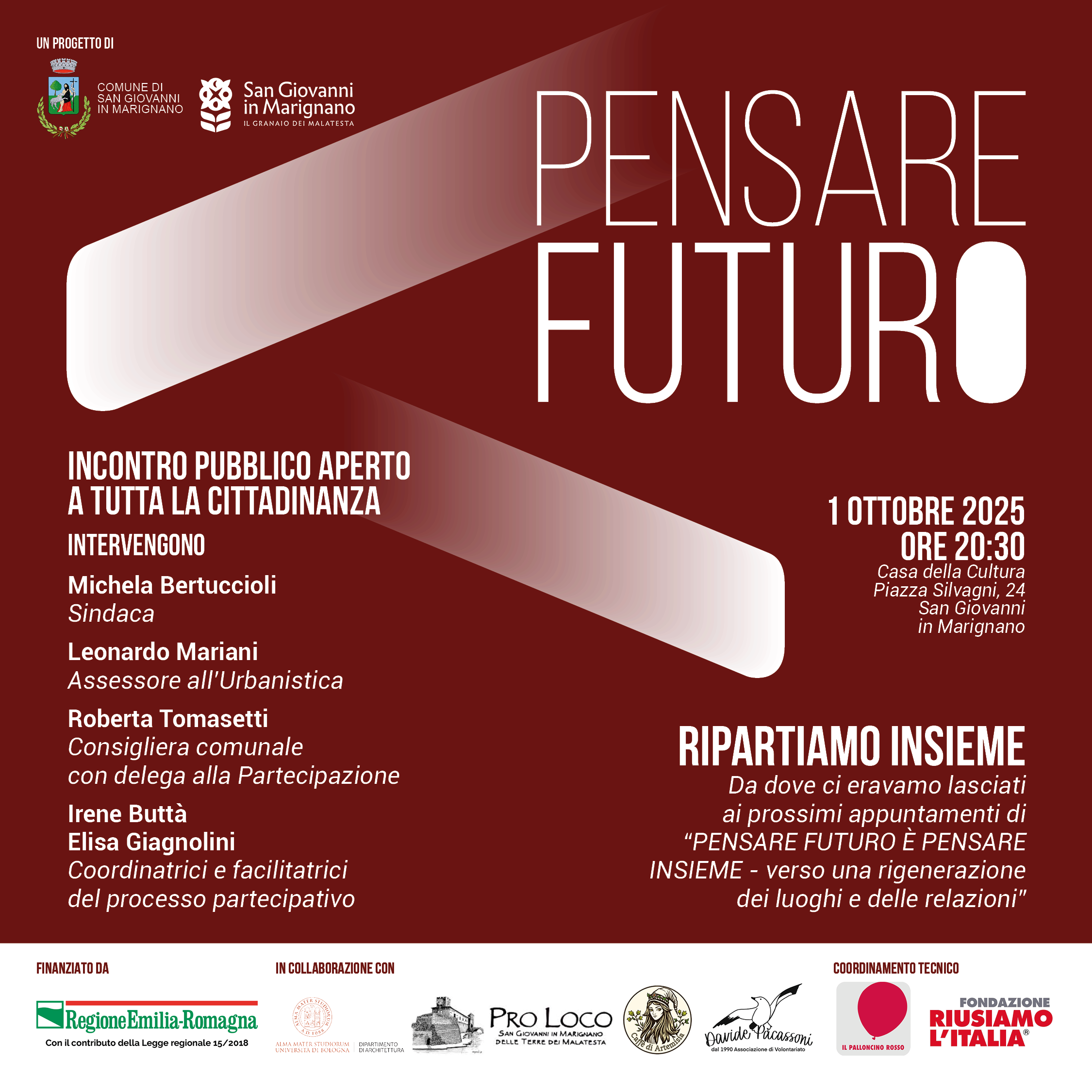 Sarà anche l’occasione per presentare le attività che si svolgeranno nei prossimi mesi all’interno del percorso partecipativo “PENSARE FUTURO È PENSARE INSIEME - verso una rigenerazione dei luoghi e delle relazioni” promosso dal Comune di San Giovanni in Marignano e finanziato dal Bando Partecipazione 2025 della Regione Emilia-Romagna.