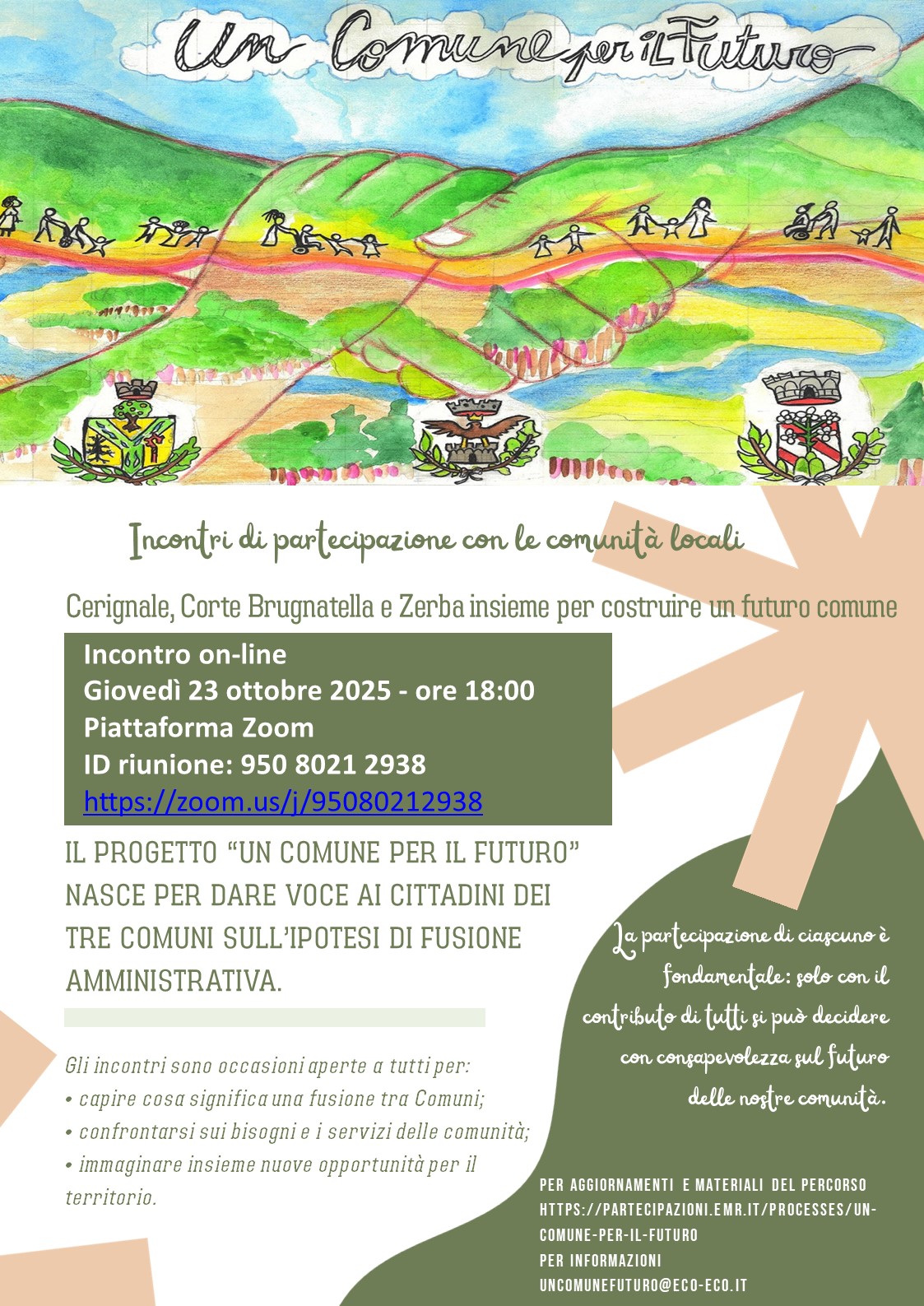L’incontro del 23 ottobre 2025 si è svolto in modalità da remoto sulla piattaforma Zoom, nell’ambito del percorso partecipativo “Un Comune per il futuro” promosso dai Comuni di Cerignale, Corte Brugnatella e Zerba, con il supporto tecnico di eco&eco.