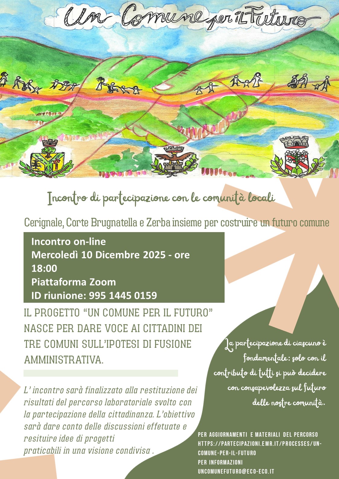 Si è svolto in data 10 dicembre 2025 l’ultimo incontro del percorso partecipativo “Un Comune per il Futuro”, dedicato alla restituzione dei risultati dei tre laboratori tematici svolti nel mese precedente e alla condivisione delle prospettive per il 2026 in vista di un eventuale percorso di fusione tra i Comuni di Cerignale, Corte Brugnatella e Zerba.