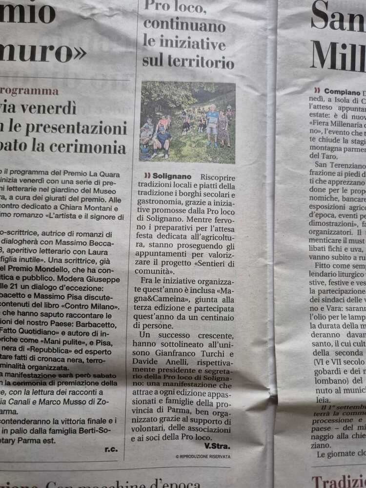 All'interno dell'evento Magna & Camèina, camminata enogastronomica non competitiva per le splendide colline solignanesi, verrà presentato il progetto Sentieri di Comunità e sarà condiviso il link per consentire la partecipazione della cittadinanza.